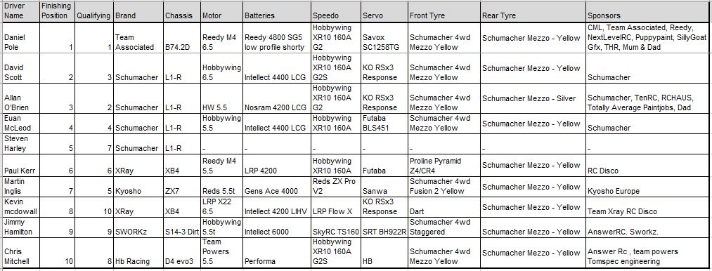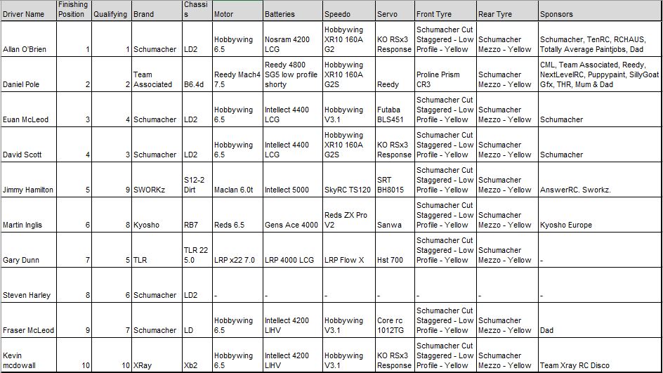 2WD finals and Reigan Bissett, Ian Petrie and Giancarlo Pallisco all held their qualifying positions in the D final, Reigan narrowly missing out on a 13 lapper, but oh so close! Well done all!