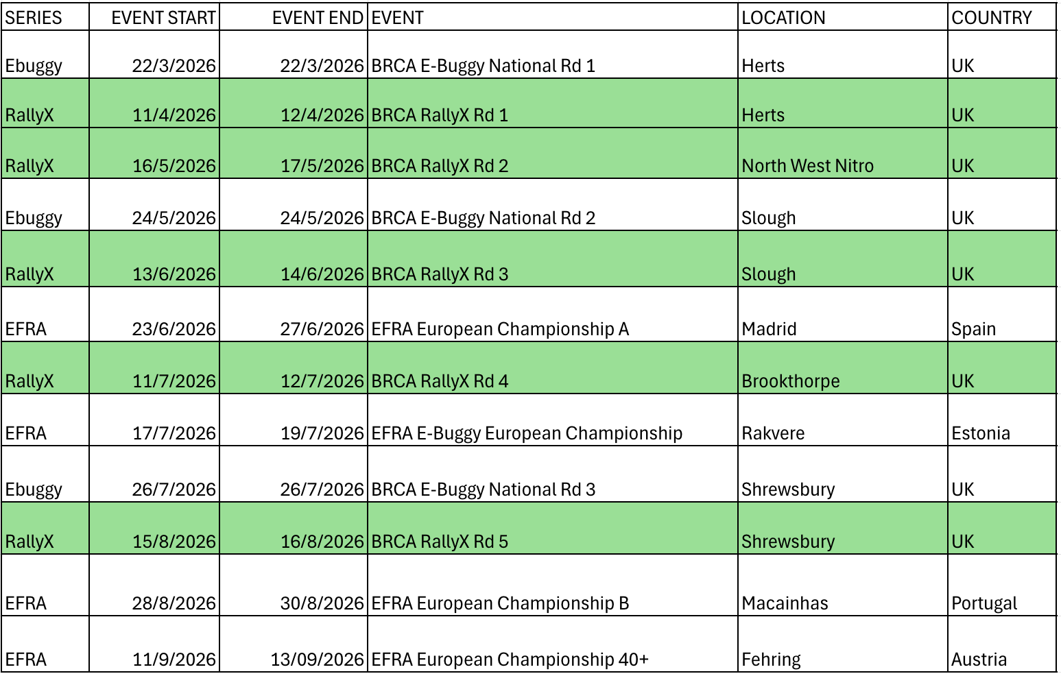 The 2026 season dates including the E-Buggy national championship is now online.