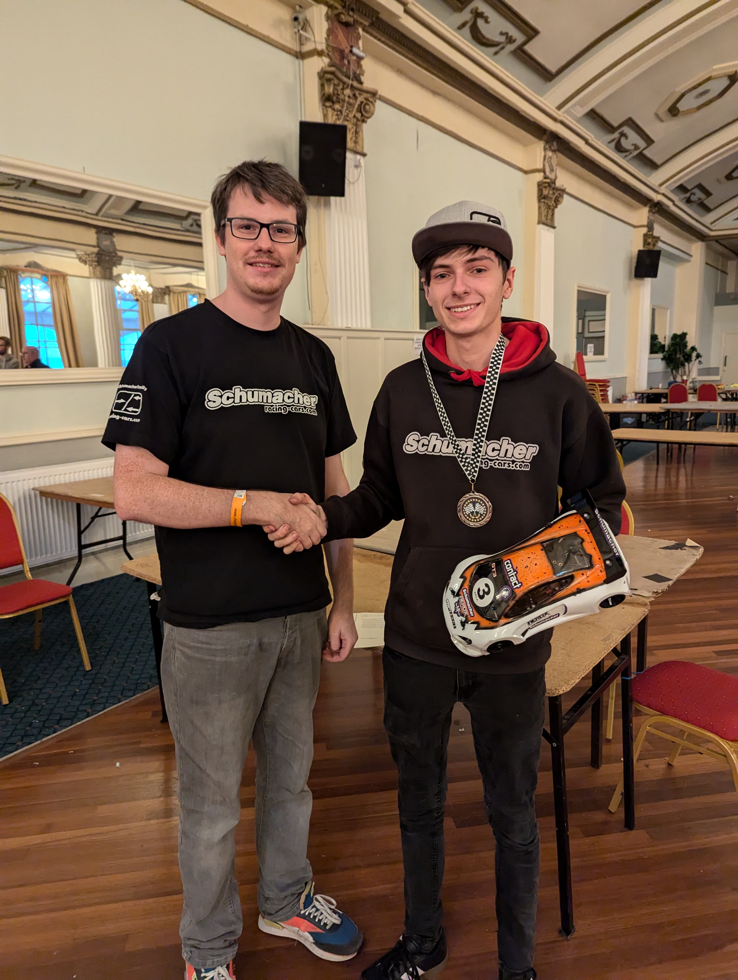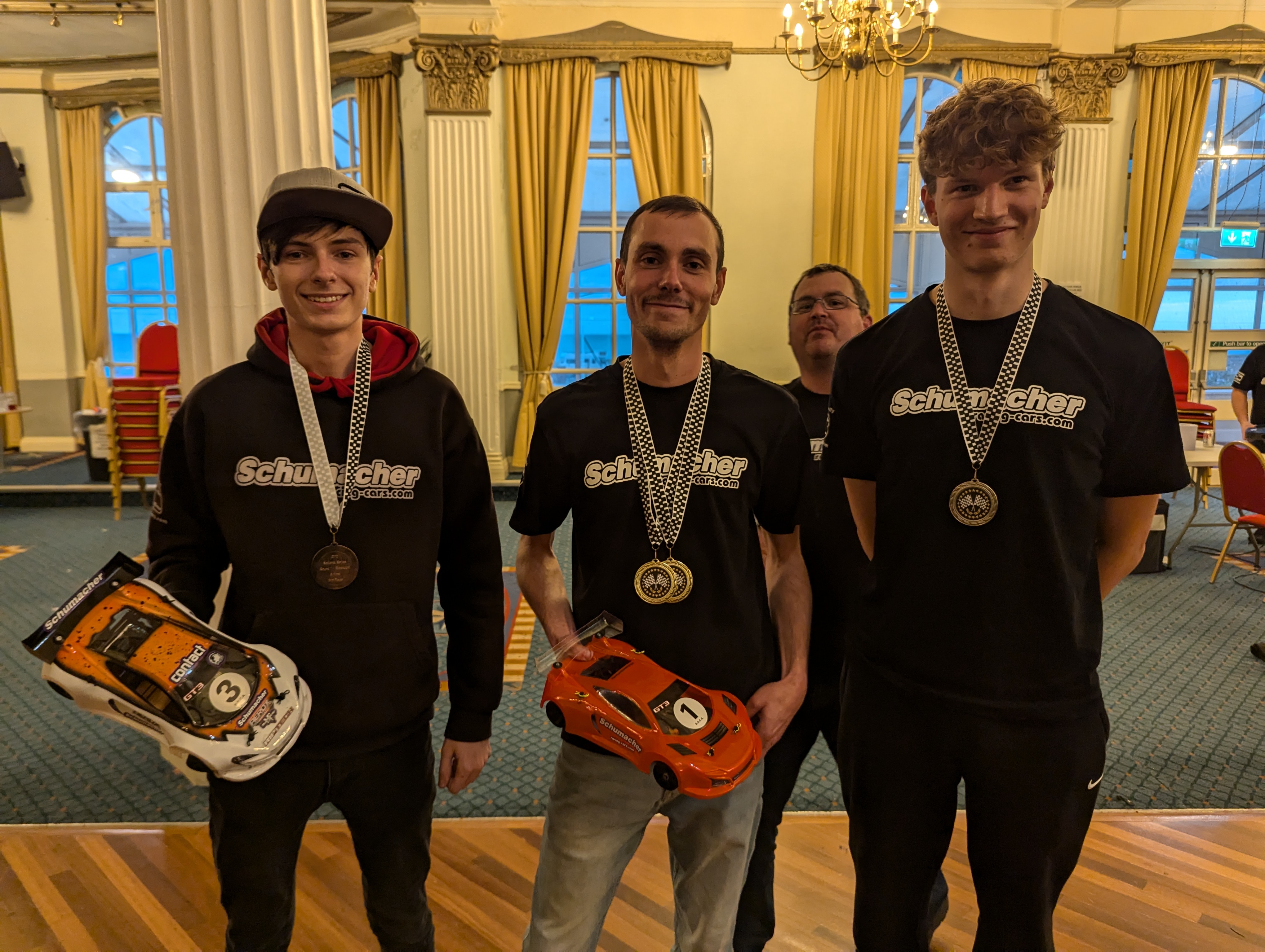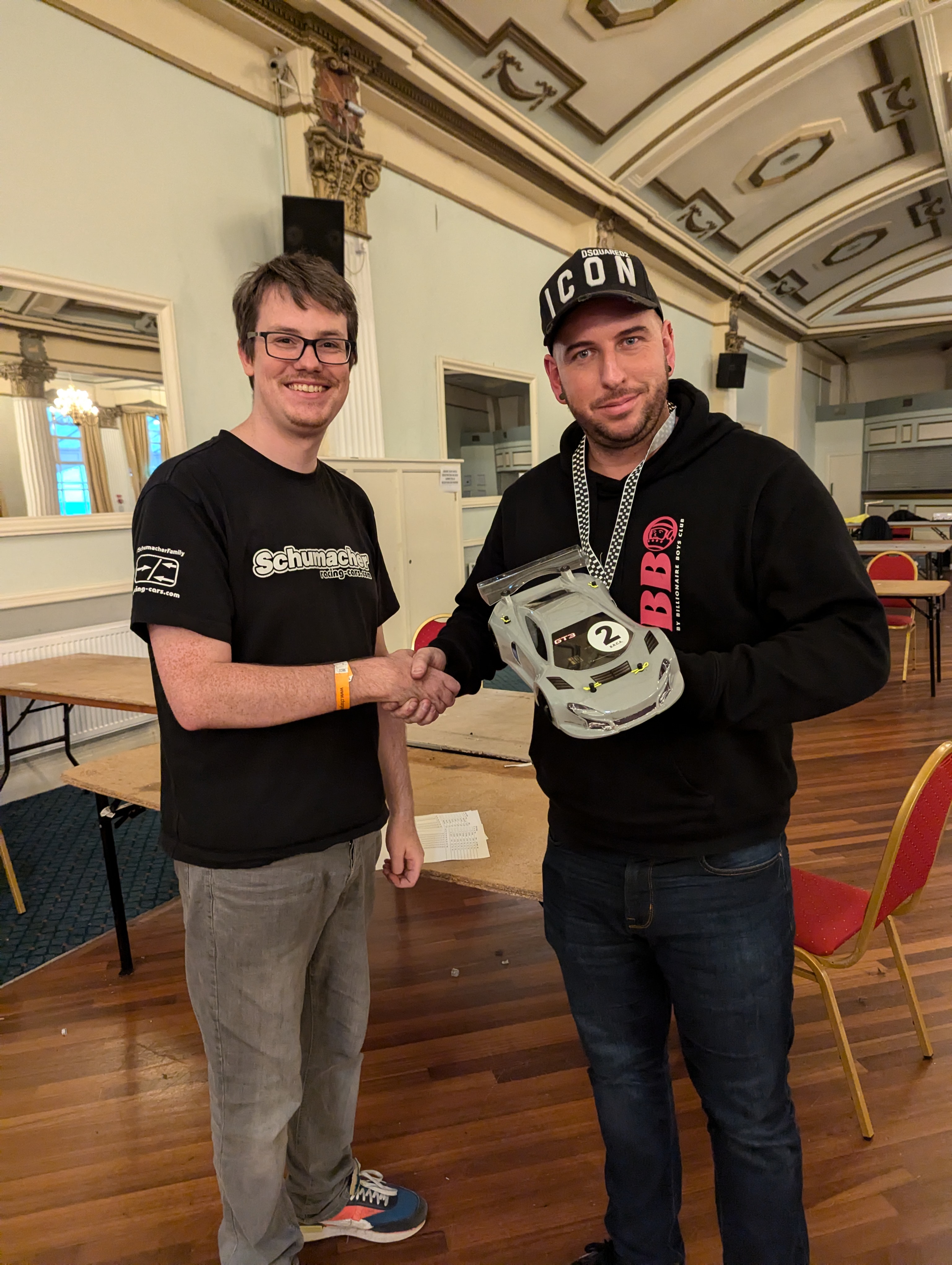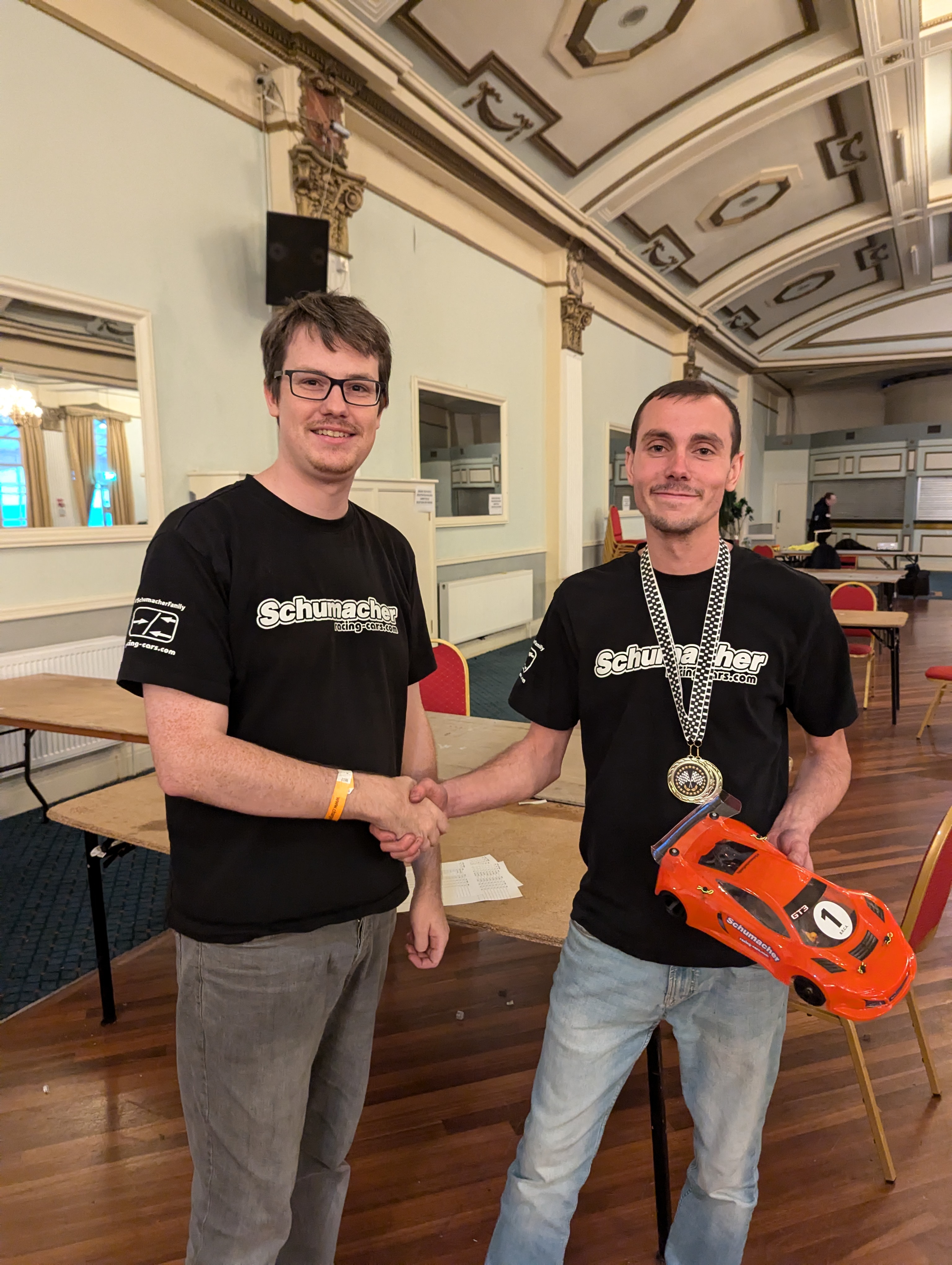 Our last race of the day, as ever, was the A final. A heavy shunt while forming on the grid saw urgent repairs to allow Ewan to start the race. Matt lead from start to finish, and despite his damaged car, Ewan managed to keep Sam behind him, to see the top 3 finishers match the qualifying line up. Behind them there was some close competition, with fifth and sixth being separated by 0.7s and plenty of swapped positions from qualifying.