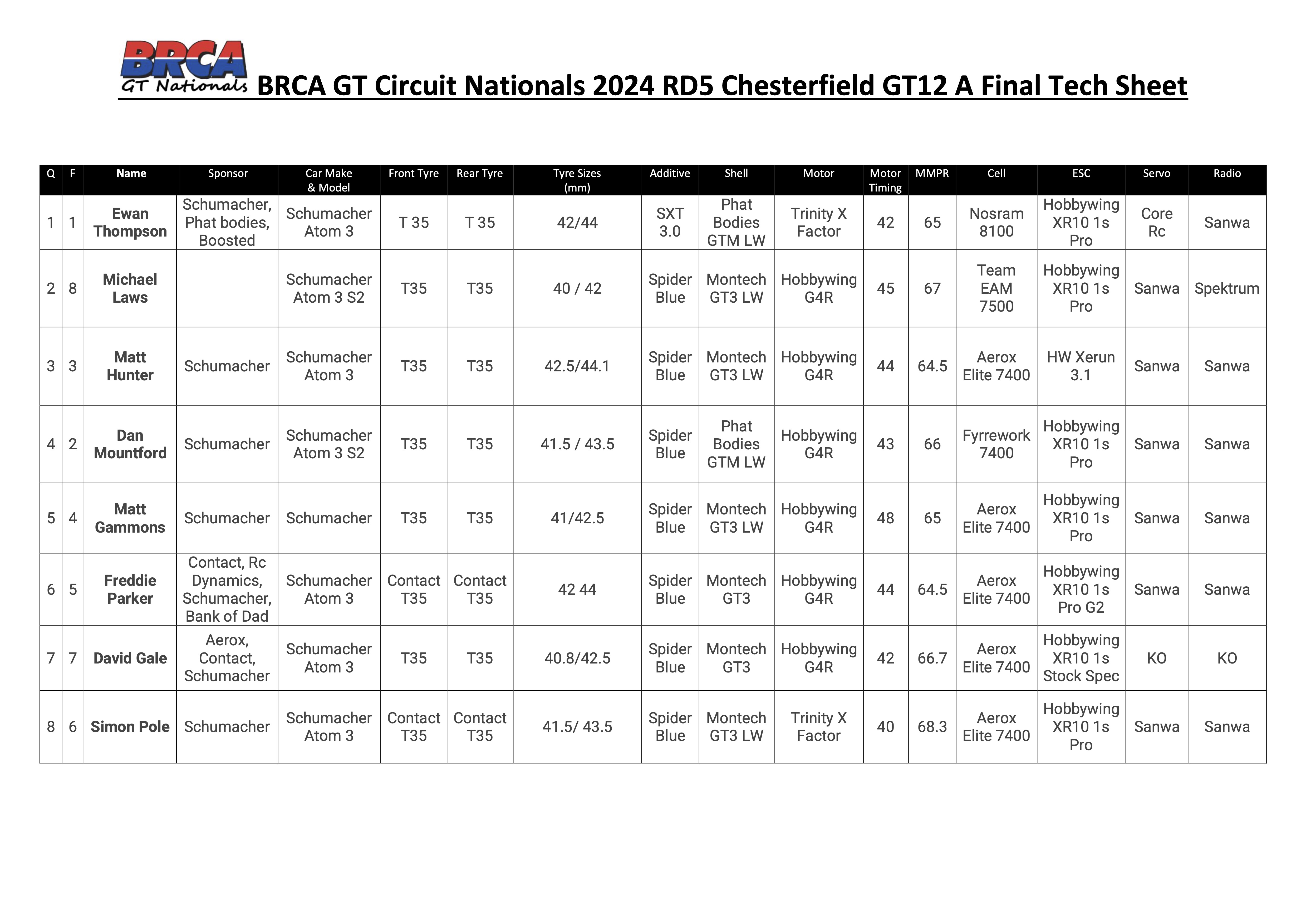Rounding out the top 8 was Dan Mountford, Matt Gammons, David Gale and Simon pole.