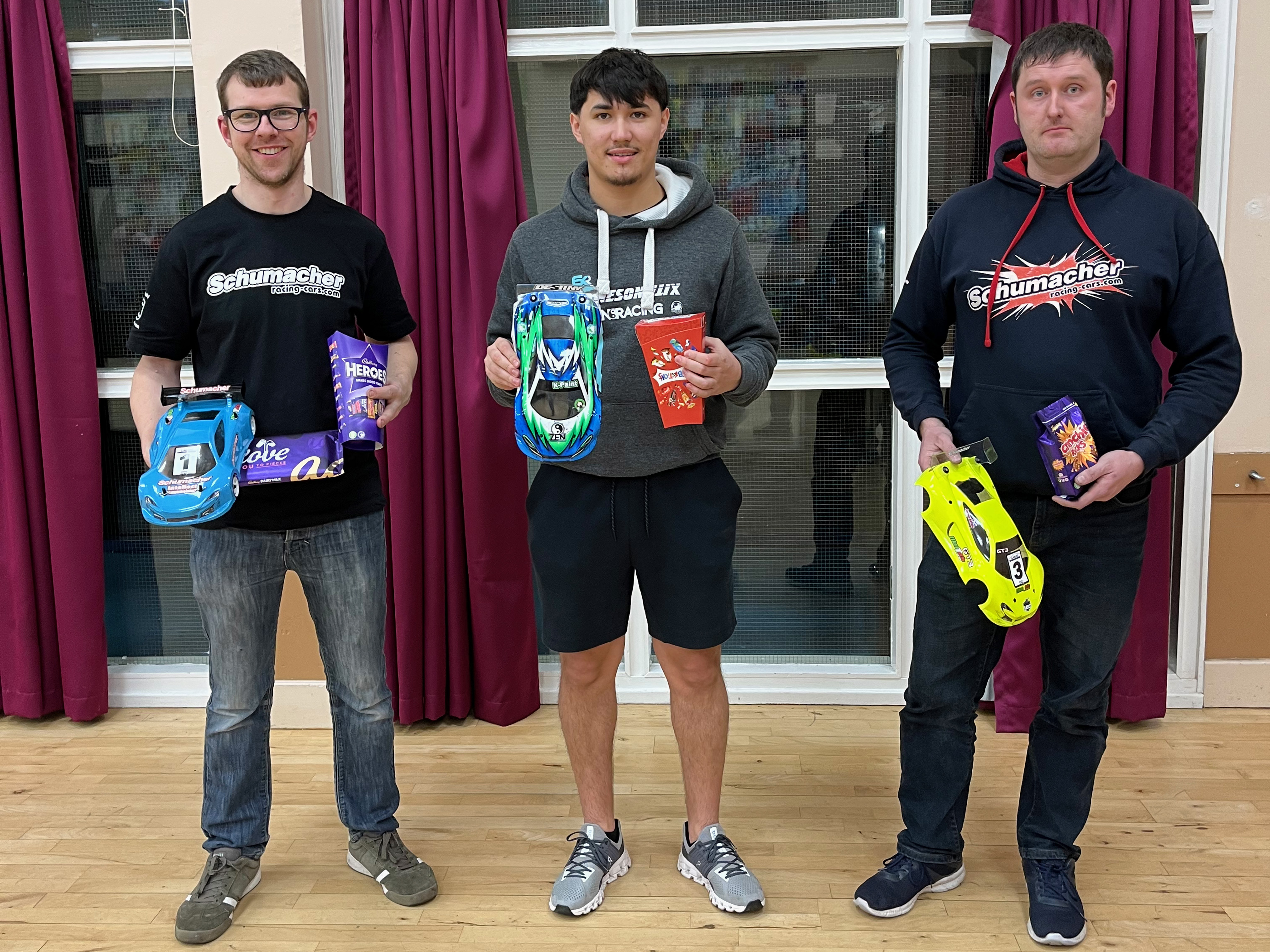 In the first A final leg John would have an early lead before a small mistake would let Alex through who then drove a clean race to take the leg one win with John in second and James in third. Leg 2 would not be so fortunate for the two lead cars who tangled and dropped down the order. James would take the win ahead of Colin and Kenneth. So it was all to play for in leg three and with tenths of a second separating the lap times of the cars in the A final it was sure to be a close race. John would lead from the front with Alex glued to his bumper, James and Kenneth were equally close together just a few car lengths back from the lead pair. With such tight margins a small mistake would be the deciding factor and John touched a track marker pushing him wide allowing Alex through. John would try to recover and chased hard, but Alex would take the win, two tenths of a second ahead to take the overall win for the day. Kenneth would take third ahead of James with these two drivers again being split by two tenths of a second. Super close competitive racing.